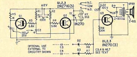 We found this timer and indicator circuit in a Radio Electronics magazine from February 1967. The transistors are from the time and the power is supplied by a battery or 12 V source.