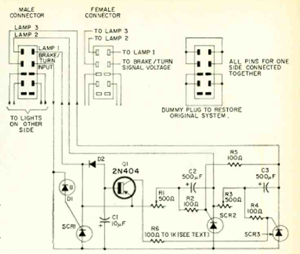 This car turn signal circuit was found in the April 1969 issue of Radio Electronics magazine. The circuit uses unijunction programmable transistors to drive incandescent bulbs.
