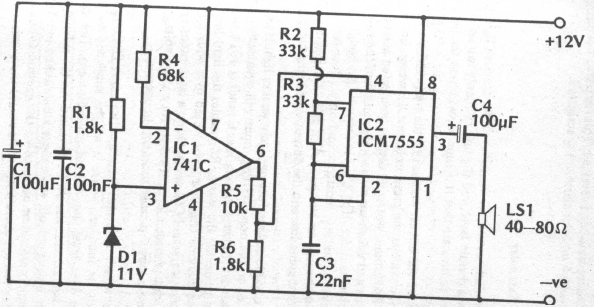 Found in old English documentation, this circuit is still current. The circuit trips with a sound when the supply voltage drops below the zener voltage.