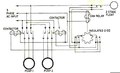 The purpose of this circuit is to determine from the position of the float which of the pumps works first. This automatism was found in Radio Electronics magazine of October 1961.