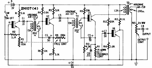 This circuit is from a publication from the 50's. Inductive components are critical, and transistors are types of the time. The circuit oscillates between 200 and 10 000 Hz.