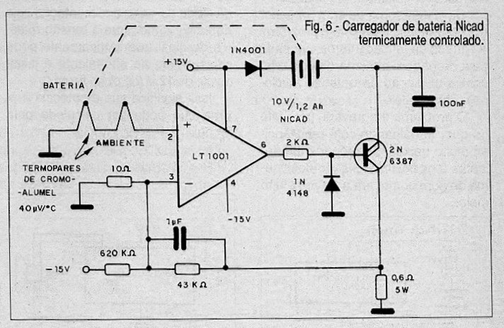 The charging current of this circuit is controlled by the temperature of the accumulators, which is very important to guarantee its integrity and extend its useful life. The sensors are thermocouples with the characteristics indicated in the diagram. The Nicad battery is 10 V with 1.2 Ah, but changes to the components can be made to charge batteries with other characteristics. The power supply is symmetrical at 15+15 V, but the positive branch of the source (+15 V) must have the highest current capacity, as it supplies the charge to the battery.