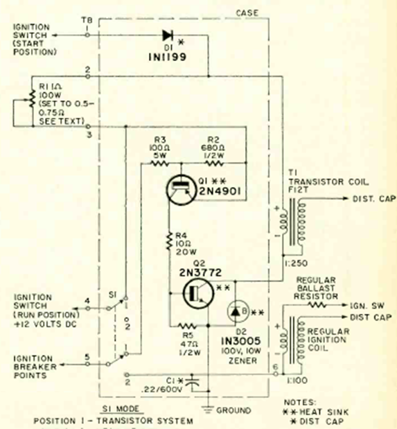This circuit for cars with mechanical breakers (contact breakers) was found in the April 1969 Radio Electronics magazine. The circuit uses two power transistors of the time.