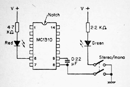 In the figure we show how to add an indicator LED to an MC1310 stereo decoder. The circuit is from an old documentation.