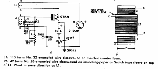 This grid dip meter was found in old American documentation. The range is from 350 kHz to 1700 kHz. The coil is made as indicated. The transistor is germanium.