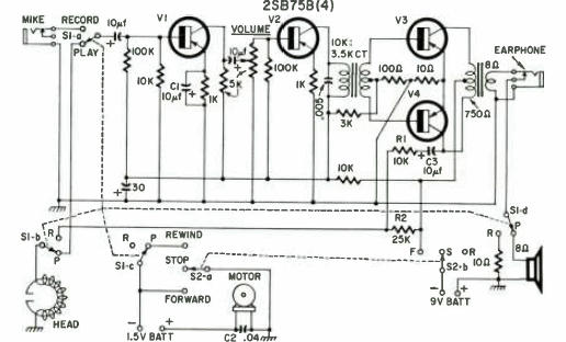 This is an audio amplifier typical of an old tape recorder. The circuit is from a Radio Electronics from November 1952. Note the use of two batteries for power, one for the motor and the other for the amplifier.