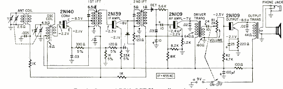 This RCA commercial radio had its circuit published in Radio Electronics magazine in August 1959. The 4-transistor circuit was a super heterodyne type with speaker output.