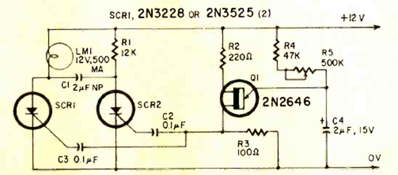 We found this traditional flasher configuration in a June 1969 Radio Electronics magazine. SCRs are controlled by the power of the lamp.