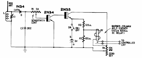This circuit operates at the frequency of a small transmitter up to 27 MHz, triggering a relay from tone-modulated signals. The circuit is from a documentation from the 60s.