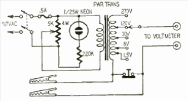 This circuit was published in Radio Electronics magazine in April 1958. It is used for electrolytic capacitors using a multimeter as an indicator instrument.