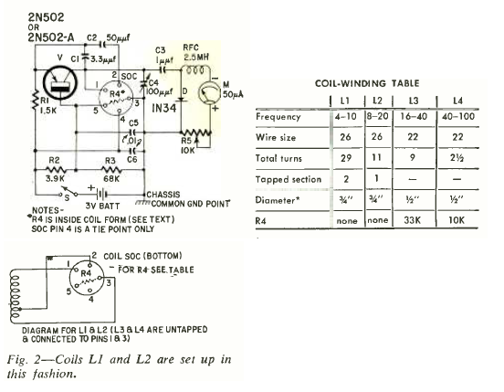 This 1-transistor circuit appeared in a February 1962 Radio Electronics. The coils for the different frequency bands are fitted into a socket.