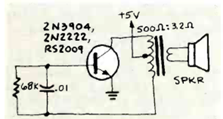 Found in the May 1982 issue of Radio Electronics magazine, this is one of many similar circuits in this section. The transformer is for the output of small radios, and C1 determines the frequency of the signal, as does the resistor.