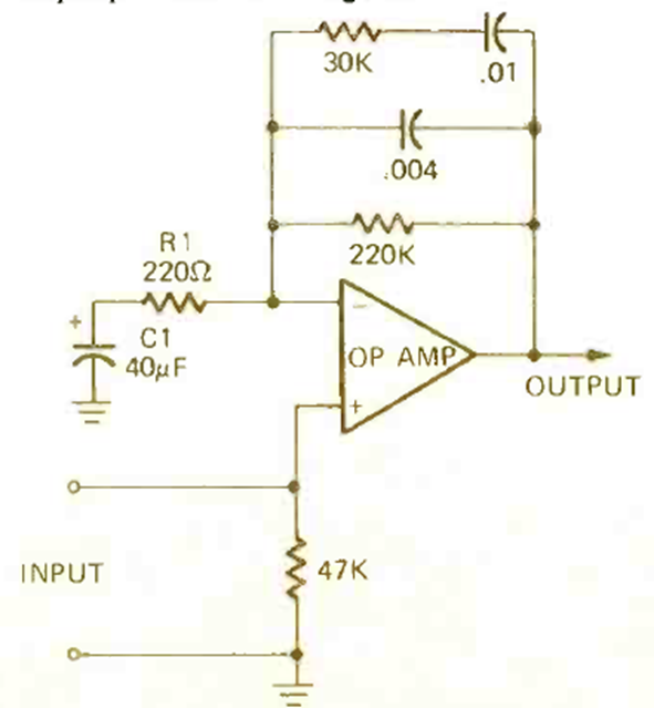 Found in a December 1972 Radio Electronics magazine article, this diagram shows an operational amplifier with RIAA equalization for use with ceramic phono pickup cartridges.