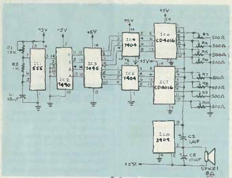 This simple electronic music box circuit was found in the April 1985 issue of Radio Electronics. The components are common, and the note adjustments are made with trimpots.