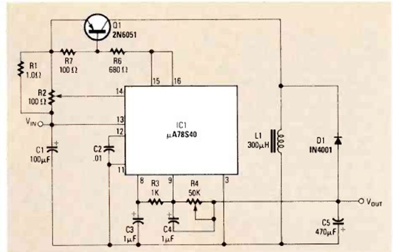 This circuit inverts the polarity of a 12 V input, providing an output of 15 V x 100 mA. The circuit is from Radio Electronics from December 1985. The transistor must be equipped with a heat sink.