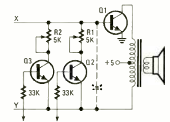 This simple Hartley circuit can generate two tones depending on the adjustment of the trimpots. The transistor can be any general-purpose transistor. We found it in the January 1979 issue of Radio Electronics.