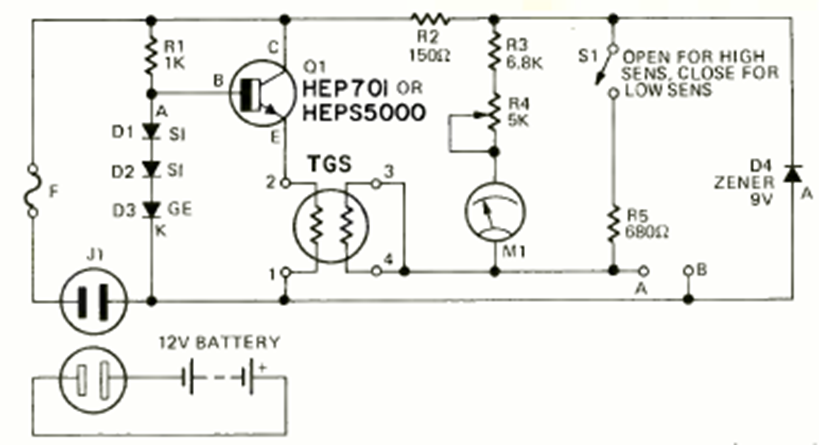 This gas sensor circuit was found in July 1976 Radio Electronics magazine. The TGS sensor was a common type at the time. Note the power supply to the circuit.