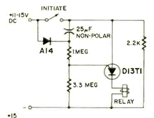 This timer circuit uses a unijunction programmable transistor. The time is given by the capacitor and the relay is of a sensitive type according to the supply voltage. The circuit is from a Radio Electronics from November 1970.