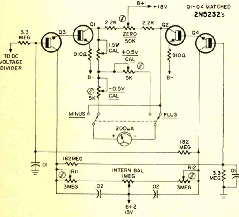 Found in the May 1971 Radio Electronics magazine, this is the circuit for a commercial high-impedance instrument. The circuit uses 4 transistors and is powered by 2 9 V batteries.