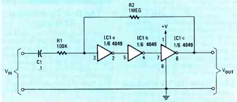 The figure shows how to use CMOS inverters as amplifiers. The circuit is from a Radio Electronics from April 1984. The supply voltage can be between 3 and 12 V.
