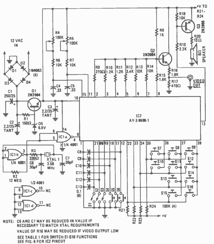 This video game is another of the AY3 series with the AY3-3606 integrated circuit. The circuit was found in the September 1980 Radio Electronics magazine. The circuit does not include the input power.
