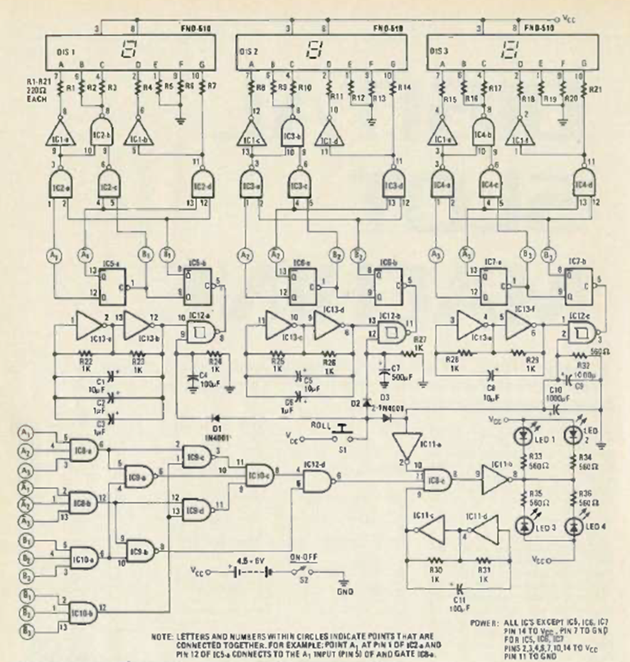 This circuit was found in the January 1980 issue of Radio Electronics magazine. It is a digital slot machine using common logic circuits. It can still be easily assembled today.