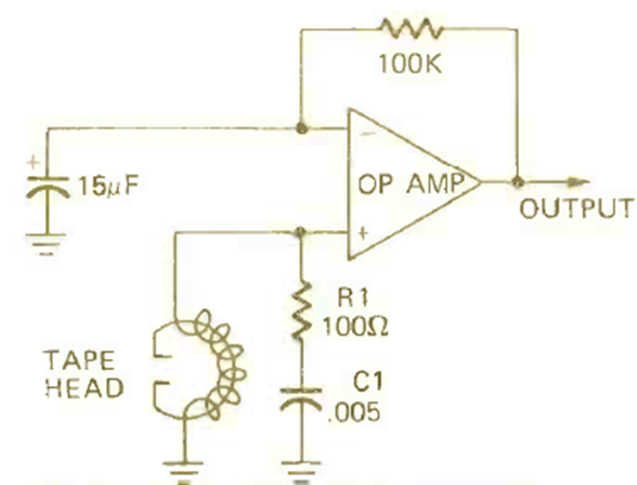 The figure shows how to use an operational amplifier with a low impedance head. The gain is provided by the 100k resistor. The circuit is from a Radio Electronics from December 1972.