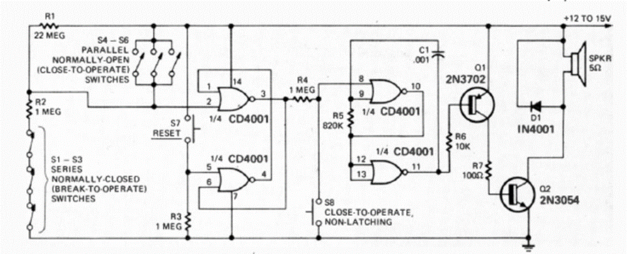 This alarm with NO and NC sensors was found in the January 1975 Radio Electronics magazine. The circuit emits a powerful sound that depends on the output transistor.