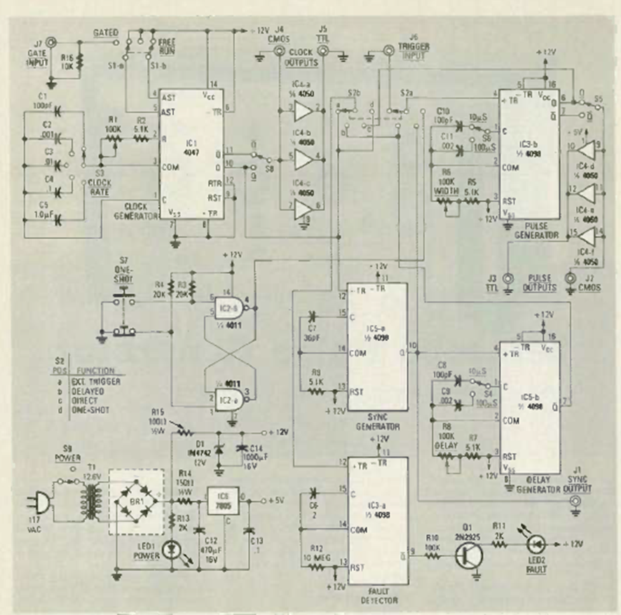 This sophisticated pulse generator was found in a Radio Electronics magazine from November 1985. It generates pulses from 1 to 100 us.