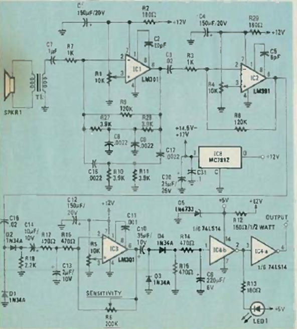 This sonic detector was published in Radio Electronics magazine in 1984. It consists of a motion sensor in which an oscillator detects variations in ambient impedance.