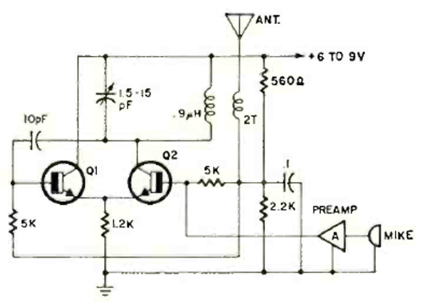 This interesting emitter-coupled circuit was found in the May 1970 issue of Radio Electronics magazine. The circuit has a range of a few tens of meters. The microphone preamplifier is not given, but an electret can be used.