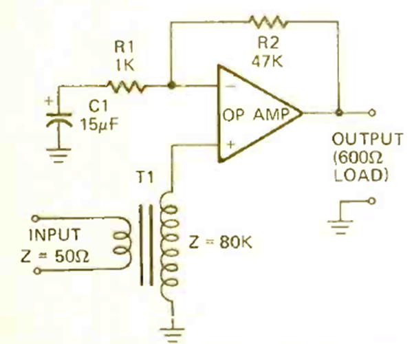 This circuit is suitable for low impedance sources, using an operational amplifier. The gain is around 40 times, and the transformer is of an old type. The circuit is from a Radio Electronics magazine from December 1972.