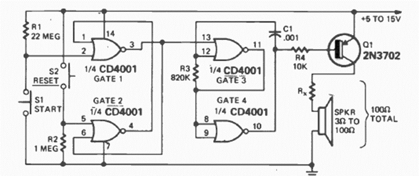 This alarm circuit triggers when S1 opens. The circuit from a January 1975 Radio Electronics magazine can be used with interrupt sensors connected in series.