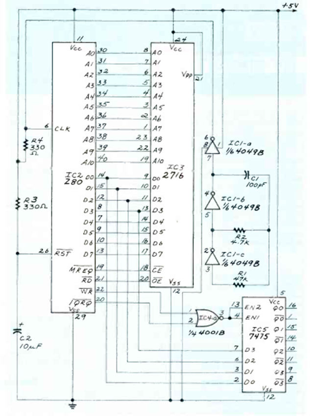 Advertised as the world's simplest circuit for a Z80, this one is from Radio Electronics magazine, December 1985. Note the supply voltages and the output.