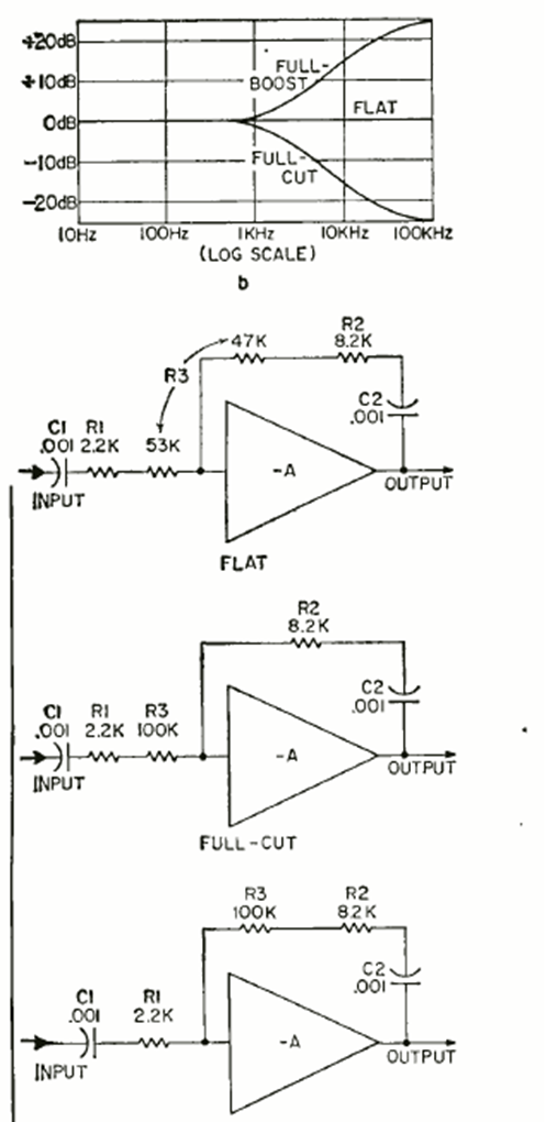 These three circuits have different treble responses. We found them in the February 1970 issue of Radio Electronics magazine. The circuit uses a newly released CA3035 from RCA.