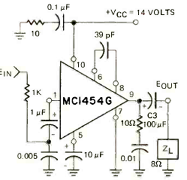 The integrated circuit is from the time. This low-power circuit was found in the April 1973 issue of Radio Electronics magazine. The circuit is for powering cars and was used in car radios of the time.