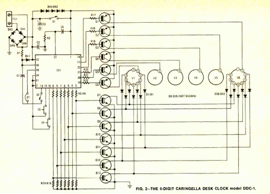 This commercial 6-digit clock circuit was found in August 1976 Radio Electronics magazine. Note the supply voltages and the use of a period module.