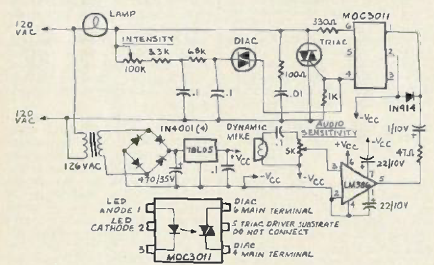 This circuit for incandescent lamps was found in the January 1980 Radio Elecronics magazine. The sensitivity can be controlled by a potentiometer and the microphone used is of the dynamic type.