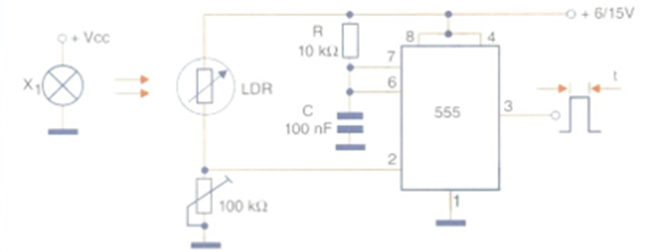 The adjustment of the circuit trigger point depends on the intensity of the light source and can be done by a 100 kΩ trimpot on pin 2. For weak sources, this potentiometer can be increased to 1 MΩ. It is worth remembering that the 555 integrated circuit can directly excite a stage with a relay, or even stages of logic circuits with TTL or CMOS technology. The light sources depend on the desired sensitivity. The complete circuit of this detector is shown in the figure.