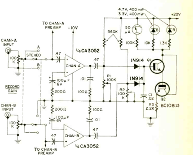This stereo meter-indicator was found in the August 1971 issue of Radio Electronics magazine. The transistors are known types and BC548 equivalents can be used.