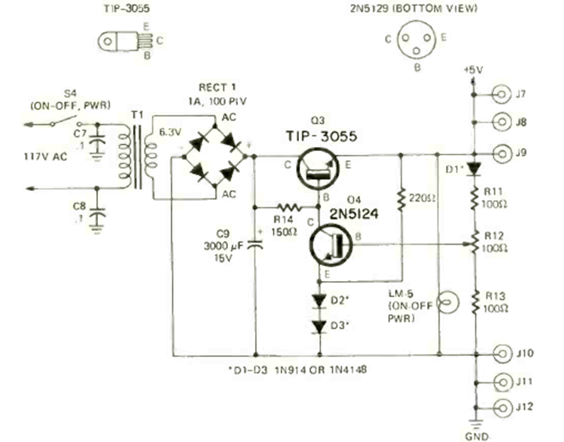 We found this TTL power supply circuit in the December 1972 issue of Radio Electronics magazine. The circuit uses a 1 A transformer and the 2N3055 transistor must be equipped with a good heat sink.