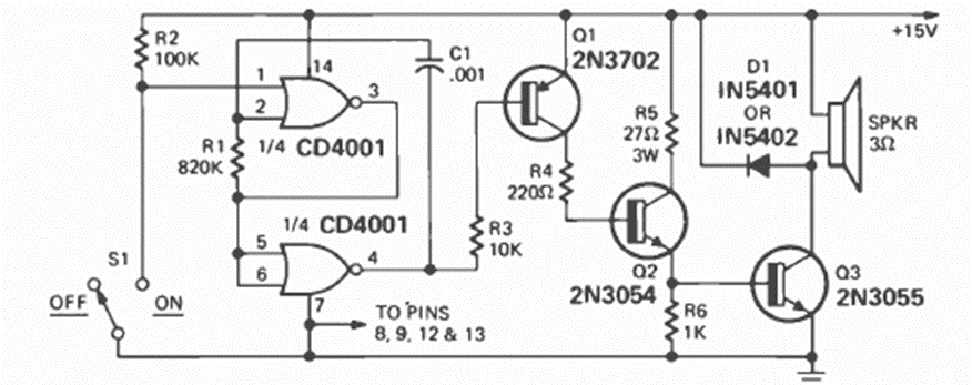 This alarm oscillator was found in the December 1974 issue of Radio Electronics magazine. The power transistor must be equipped with a good heat sink. The Frequency basically is given by C1.
