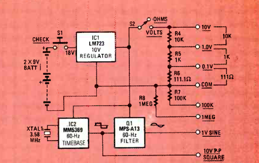 This circuit was found in the June 1982 issue of Radio Electronics magazine. It provides reference voltages for calibrating instruments such as oscilloscopes.