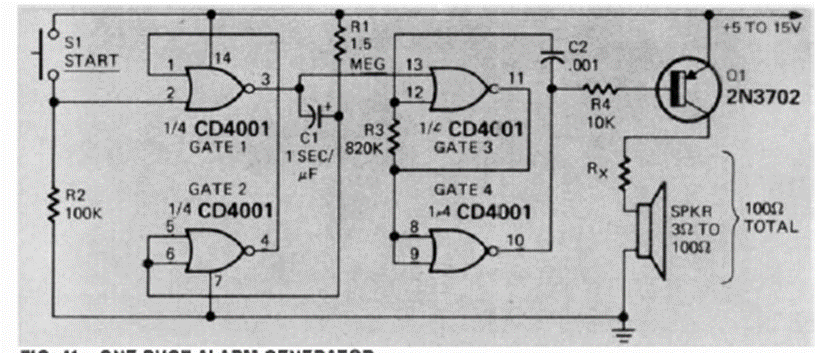 This two-tone alarm siren was found in the January 1975 issue of Radio Electronics magazine. The power transistor can be changed and with it, Rx has values from 10 to 47-ohm.