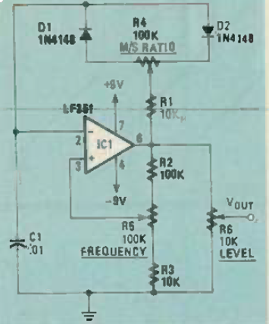 This oscillator was found in the September 1984 issue of Radio Electronics magazine. The frequency is given by C1 and the generated signal can have its level adjusted by a potentiometer. R5 controls the frequency.