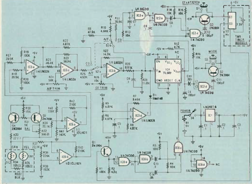 This circuit was found in the May 1984 issue of Radio Electronics magazine. It analyzes the exhaust gases emitted by a car. The circuit uses a special gas sensor from that time.