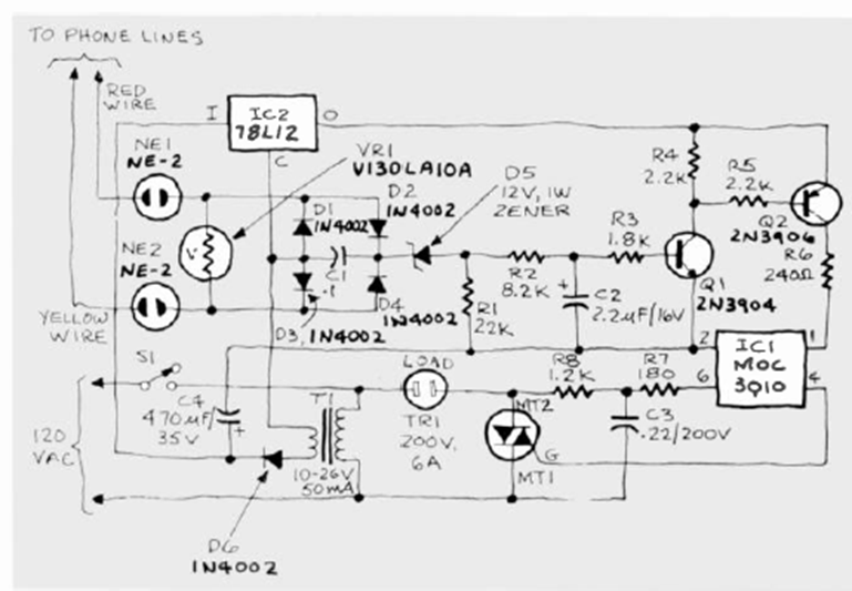This circuit was found in the October 1983 Radio Electronics issue. It is applicable to old analog telephones. The circuit uses common components.