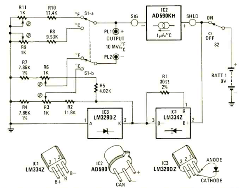 This circuit was found in the July 1978 issue of Radio Electronics magazine. The circuit uses a common digital voltmeter as the indicator. The sensors are integrated circuits of the time.