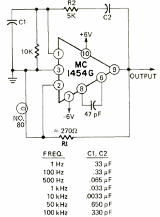 This circuit for frequencies from 1Hz to 100 kHz was found in the June 972 Radio Electronics magazine. C1 and C2 depend on the frequency. The operational IC can be a 741.