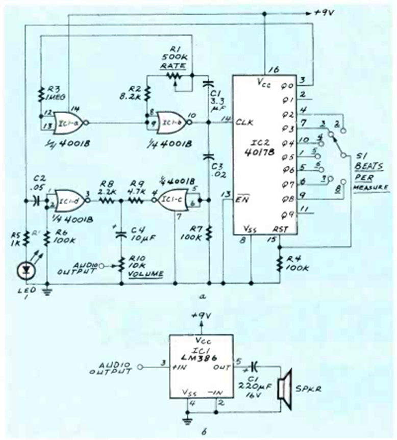 This sophisticated metronome has accented tones for better use. The circuit is from Radio Electronics from December 1985. The amplifier stage is provided.